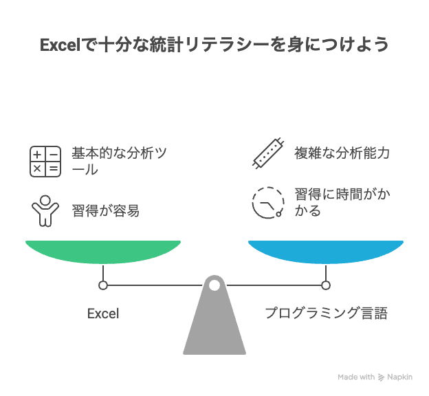Excelの基本的な関数を使いこなし、状況をパッと理解できるようになること。それが、ビジネスパーソンがまず目指すべき「統計リテラシー」のゴールです。Excelは、多くの企業で標準的に利用されているツールであり、特別なスキルや追加のソフトウェアを必要とせずに、すぐにデータ分析を始めることができます。