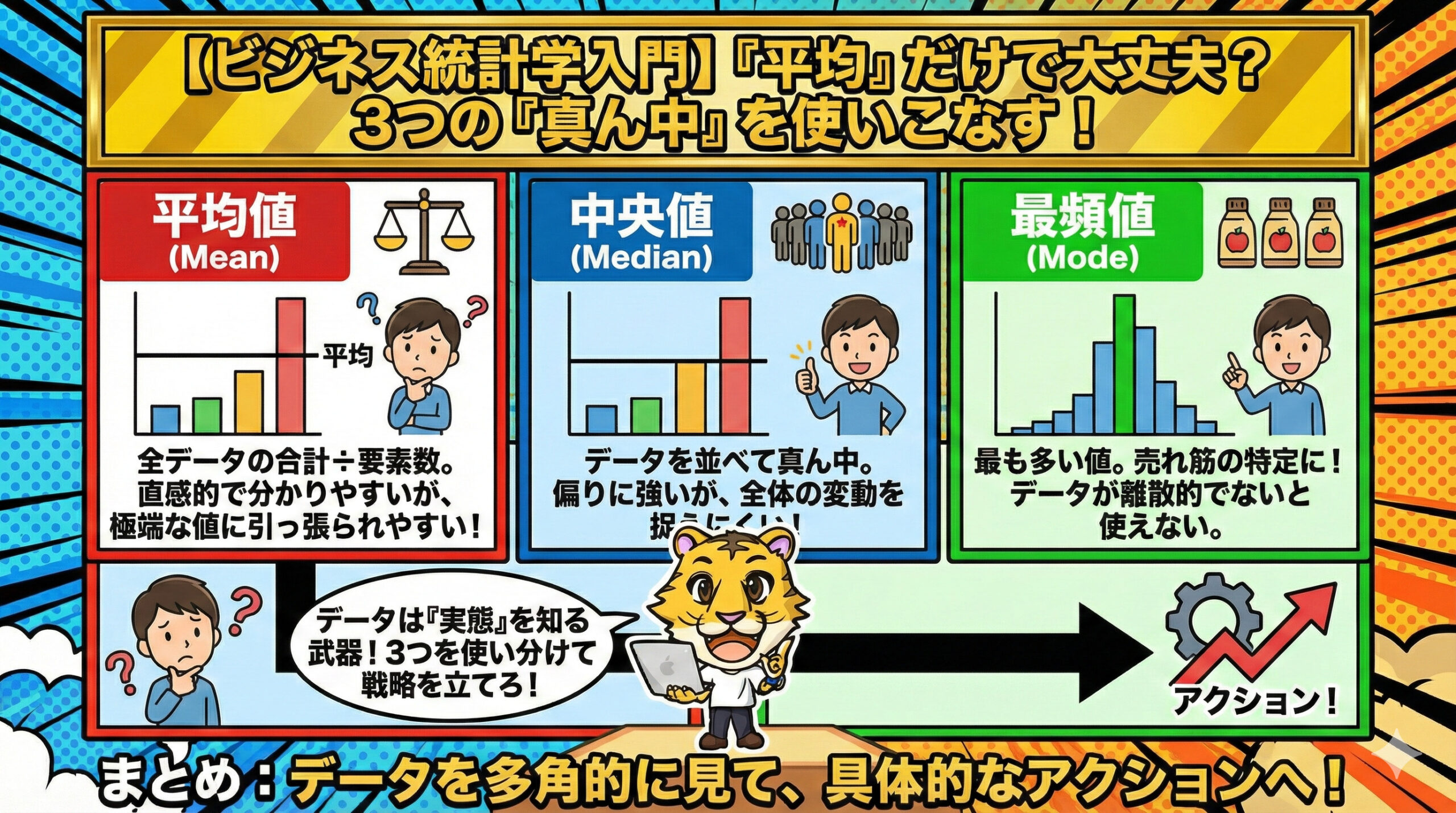統計学をビジネスに活かすとは、単に計算することではありません。「実態(真ん中)を知り、それに基づいた作戦を立て、意思決定すること」です。