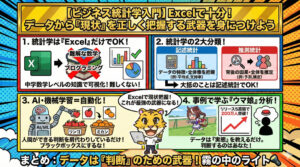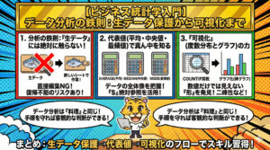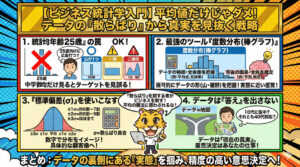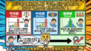 数字に踊らされず、その背後にあるビジネスの現場(散らばりの意味)を読み解くことが、データ分析において最も重要です。データ分析は、あくまで意思決定をサポートするためのツールであり、最終的な判断は、ビジネスの知識や経験に基づいて行うべきです。