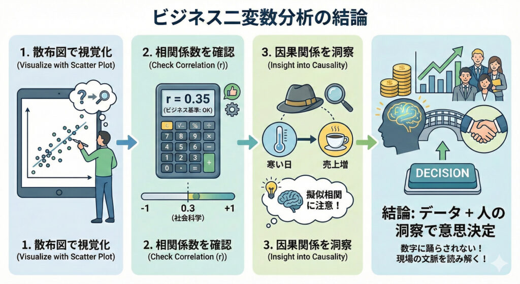 ビジネスにおける2変数分析のポイントは以下の通りです。