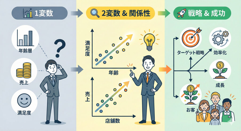単に「顧客の年齢層が高い」という事実(1変数の分析)だけでなく、「年齢が若いほうが実は顧客満足度が高い」といった**関係性(2変数の分析)**が見えてこそ、有効な戦略を立てることができます。例えば、年齢層が高い顧客が多いというデータだけでは、高齢者向けの製品開発やサービス改善に注力するという戦略しか思い浮かびません。しかし、若い顧客層の方が満足度が高いという関係性が見えてくれば、若年層向けのマーケティング戦略を強化したり、若年層が好むような新しい製品やサービスを開発したりするなど、より多様な戦略を検討することができます。