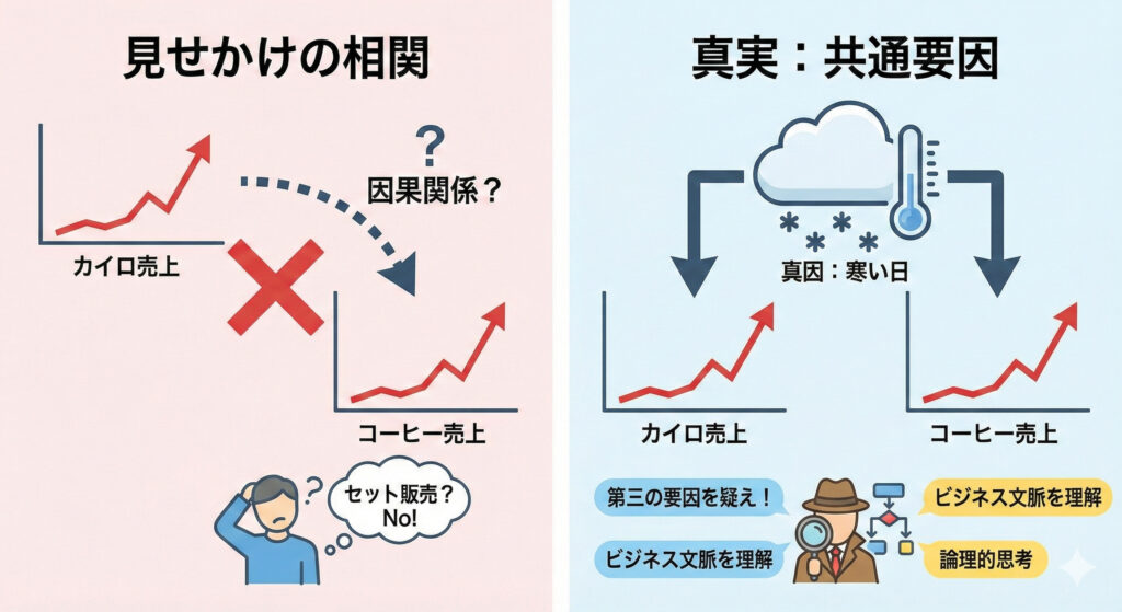 例:カイロの売上とホットコーヒーの売上に相関があった。「カイロを買う人はコーヒーも買う」と分析してセット販売するのは間違いです。真実は**「寒い日(共通要因)」**だったから両方売れただけです。