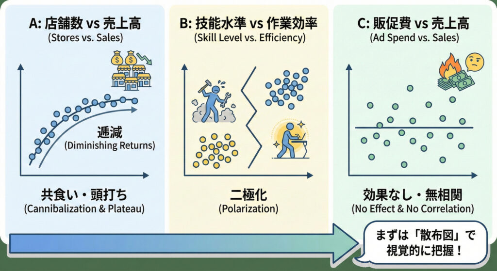 - 事例③ 販促費と売上高(無相関の発見): 販促費を増やしても売上が変わらない、あるいは下がっている場合、そのキャンペーンには効果がなかったことが一目でわかります。