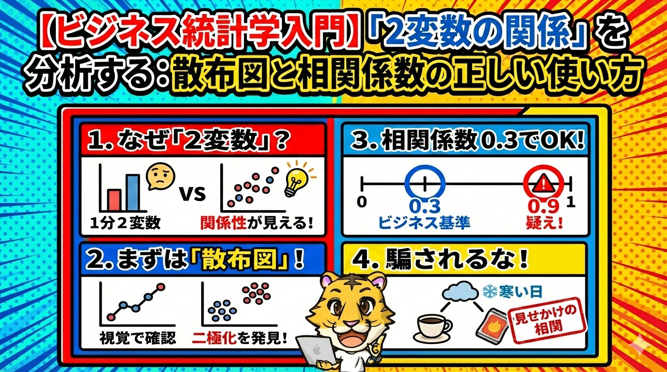 ビジネスの現場では、単一の数値データだけでは見えてこない、2つの変数間の関係性を分析することが重要です。本記事では、2変数の関係を分析するための強力なツールである「散布図」と「相関係数」の正しい使い方、そしてデータ解釈における注意点について解説します。ビジネスにおける意思決定をデータに基づいて行うために、これらのツールを効果的に活用する方法を学びましょう。
