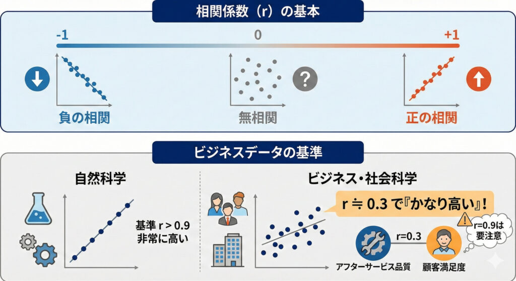 - 社会科学(ビジネス)の世界: 人間の心理や社会現象は複雑な要因が絡み合うため、**0.3もあれば「かなり高い」**と判断されます。