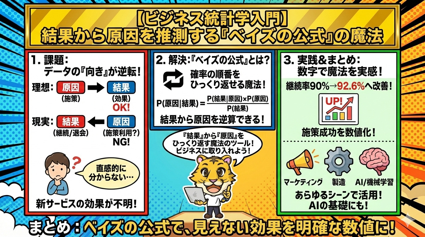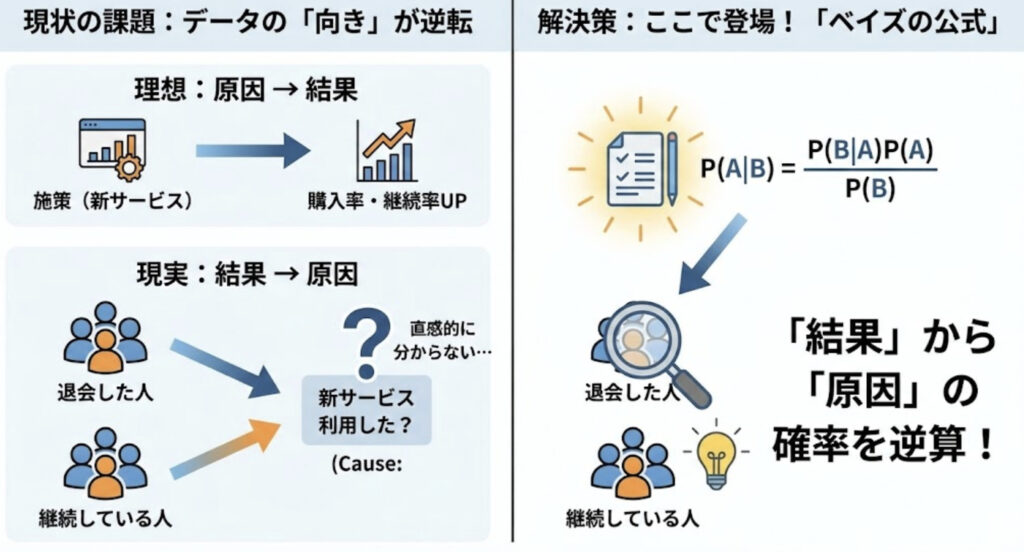 ビジネスにおいて、施策の効果検証は不可欠です。しかし、データが常に「原因→結果」の順で揃っているとは限りません。本記事では、データが逆の形でしか手に入らない場合に役立つ「ベイズの公式」を使った分析手法を、ビジネスパーソン向けにわかりやすく解説します。サブスクリプションサービスの継続率調査を例に、具体的な計算方法と、ベイズの公式がビジネスやAI分野でどのように活用されているかを紹介します。