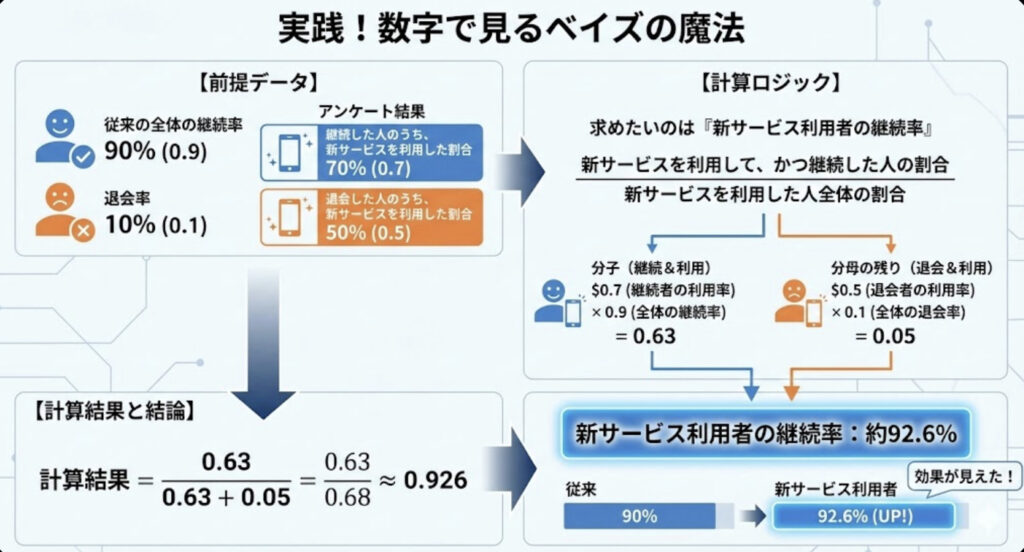 - $P(\text{継続}|\text{新サービス利用}) = \frac{P(\text{新サービス利用}|\text{継続}) \cdot P(\text{継続})}{P(\text{新サービス利用})}$