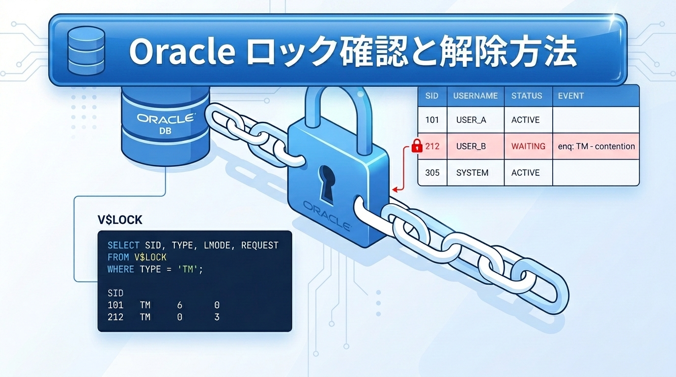 Oracleデータベースで「テーブルが更新できない」「クエリが返ってこない」といった症状の原因の多くはロック競合です。本記事では、ロックの状態を確認するSQLと、ロックを解除(セッションのKILL)する手順を解説します。